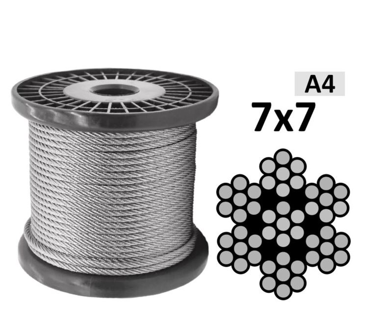 Трос для растяжек, изготовленный по регламенту технического стандарта DIN 3055, представляет собой канат из стальной проволоки плетения 7х7. Проволока для троса изготовлена из нержавеющей стали аустенитной группы А4 с высокой коррозионной устойчивостью. Стальной трос DIN 3055 предназначен для универсального применения в качестве такелажного приспособления негрузового назначения. Подходит для использования при создании растяжек, для удержания вертикально ориентированных конструкций, при организации ограждений и подвесов, для фиксации грузов при транспортировке.